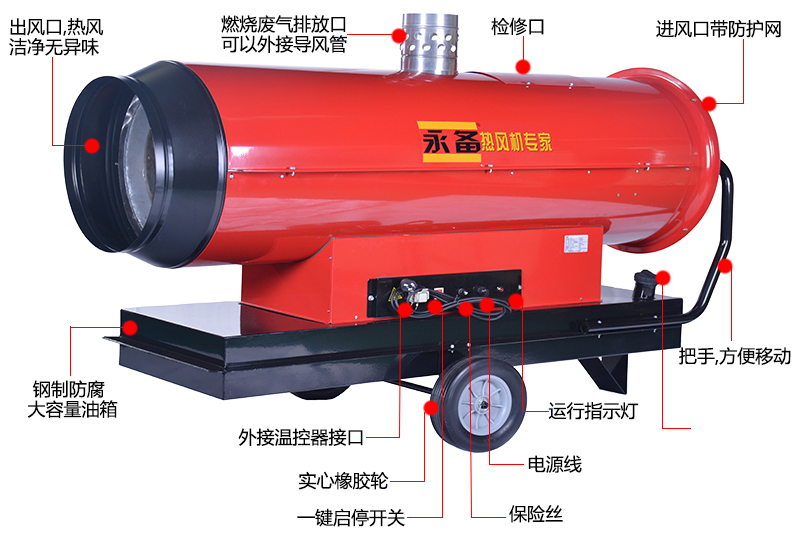 1.柴油或煤油用作燃料。燃烧产生的热量由热风机后部的强力风扇排出。采用清洁燃烧技术,充分燃烧燃料,减少有害物质