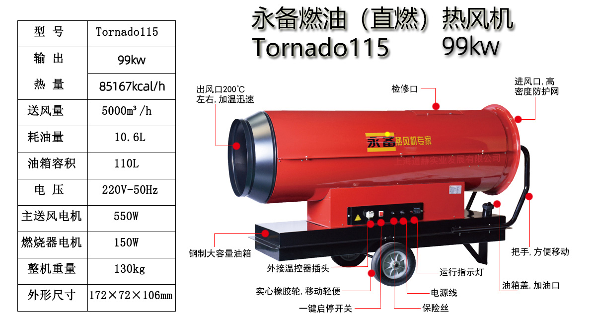 ◆ 工业燃油热风机Tornado115 全国联保服务:整机一年保修